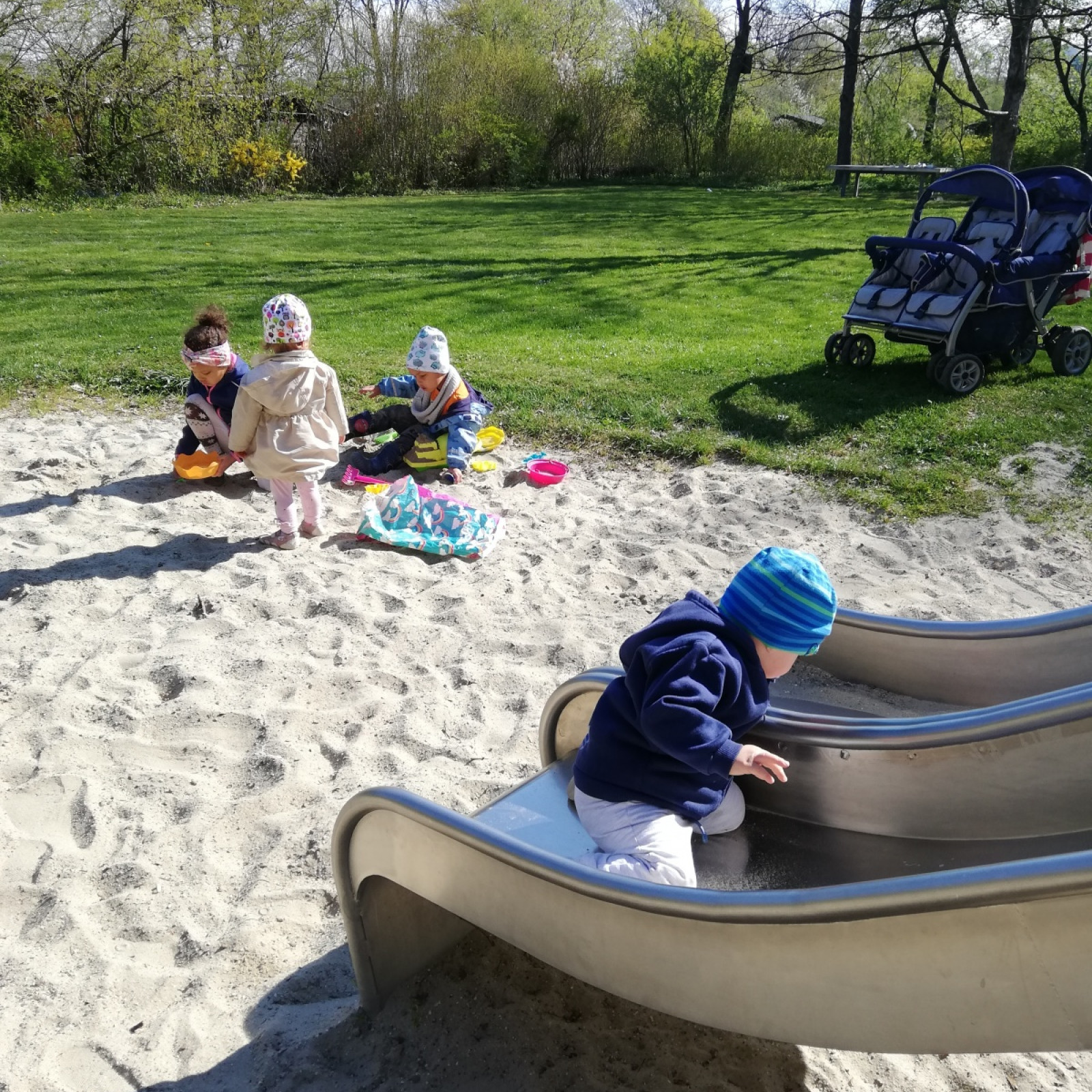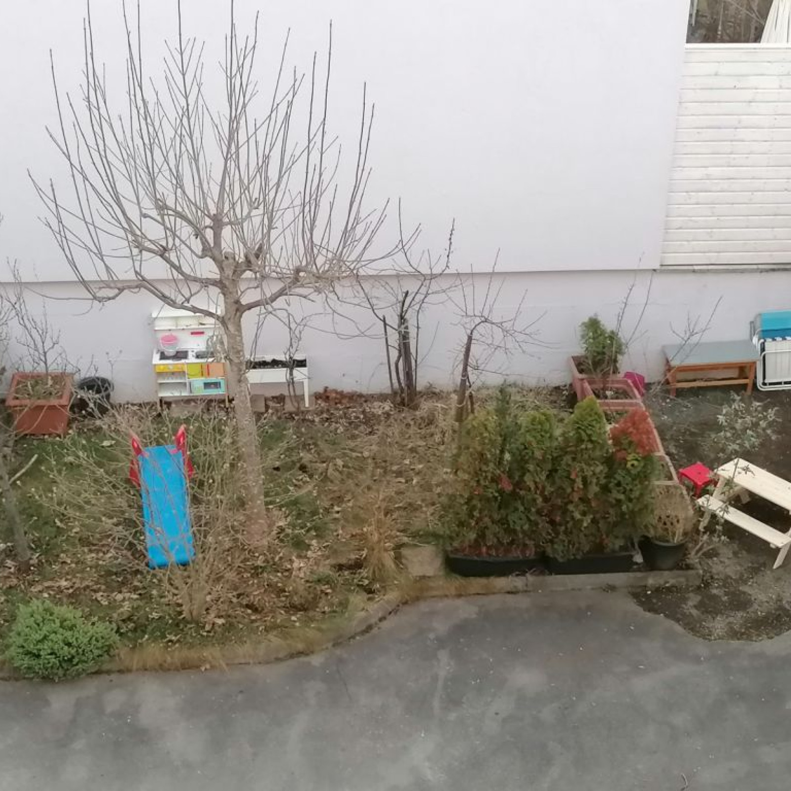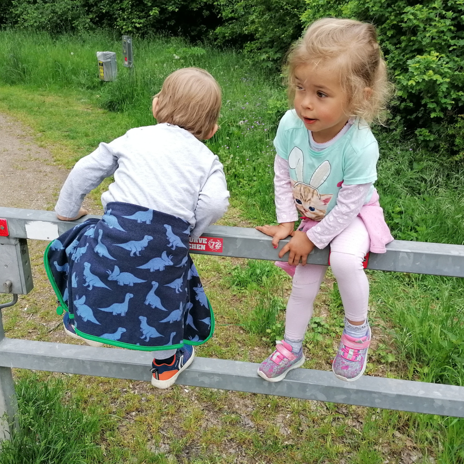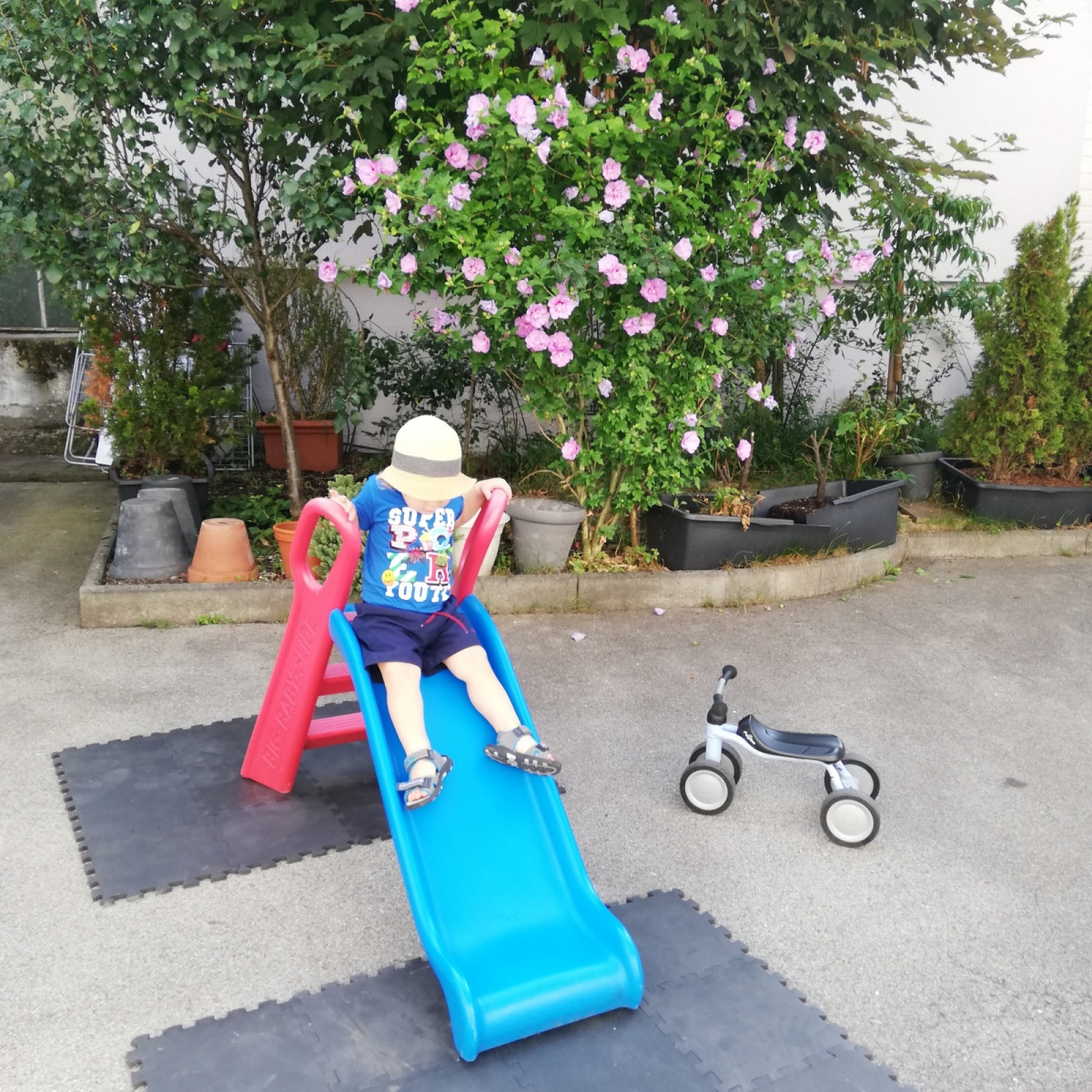 Wir haben an unserem Wohnhaus einen abgegrenzten Hof, welcher auf der hinteren Seite durch ein Tor (Türklinke außer Kinderreichweite) und an der vorderen Seite durch eine schwere Holztür verschlossen ist. In diesem Hof bieten sich unter anderem die Möglichkeiten mit Bällen zu spielen, unsere Rutsche-Autos oder ein Laufrad zu fahren oder einfach frei zu spielen. Außerdem können wir hier gemeinsam auf der kleinen Grünfläche in einem kleinen Hochbeet Gemüse, Kräuter oder Obst anpflanzen. Ebenso haben wir eine kleine Rutsche die bereits für Laufanfänger geeignet ist.