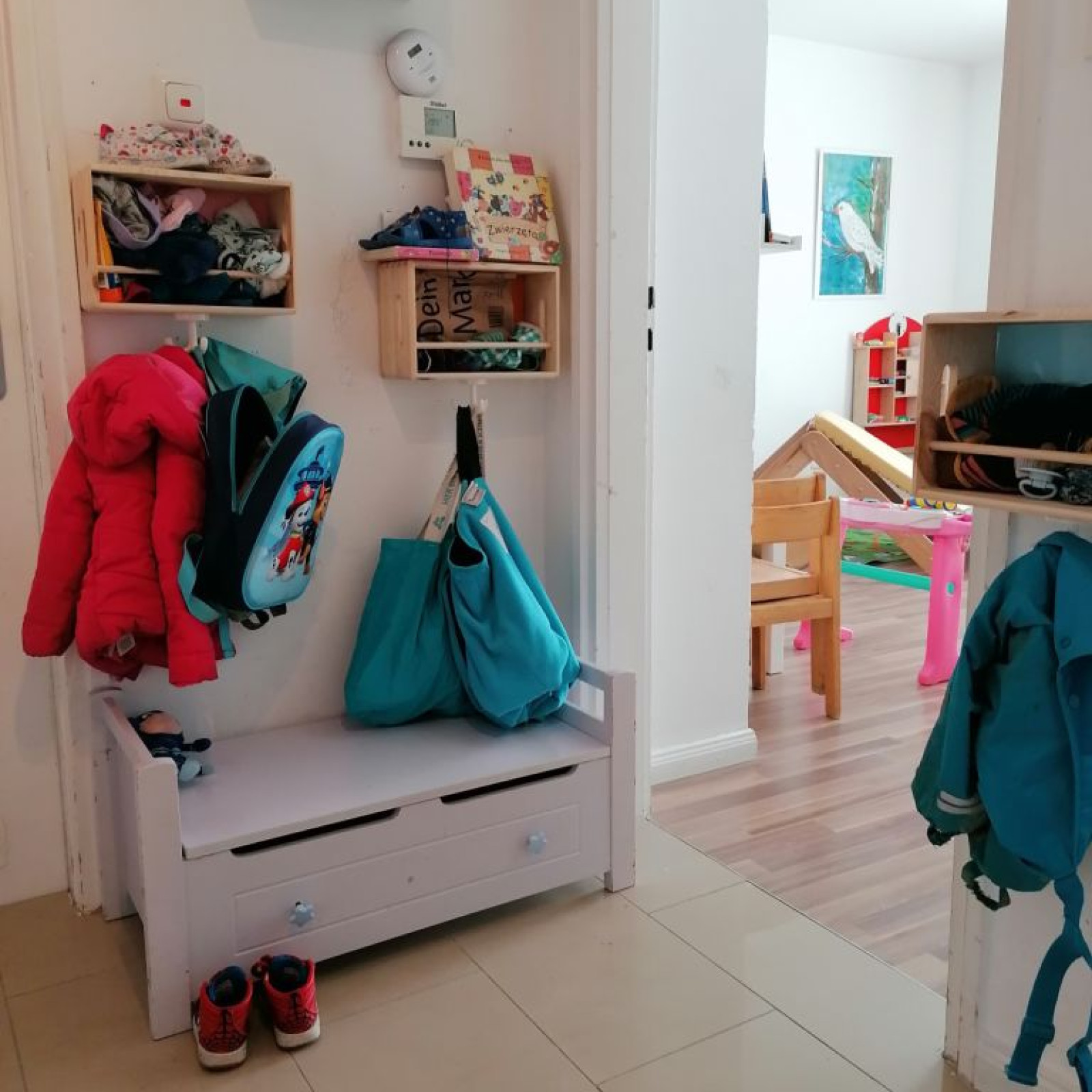 Im Flur befindet sich eine Garderobe für jedes Kind und Boxen für die persönlichen Gegenstände sowie Wechselkleidung der Tageskinder.
