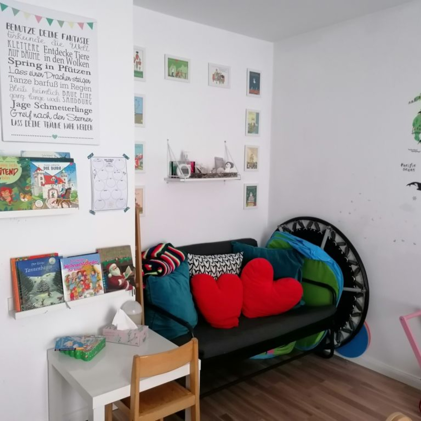 Die Kinderbetreuung findet bei mir und meiner Familie zu Hause auf einer Etage mit insgesamt 130qm statt. Wir haben ein separates Spielzimmer für die Tageskinder, in welchem auch geschlafen wird. An unserem Esstisch im Wohnbereich wird gefrühstückt, Mittag gegessen und auch mal gebastelt.